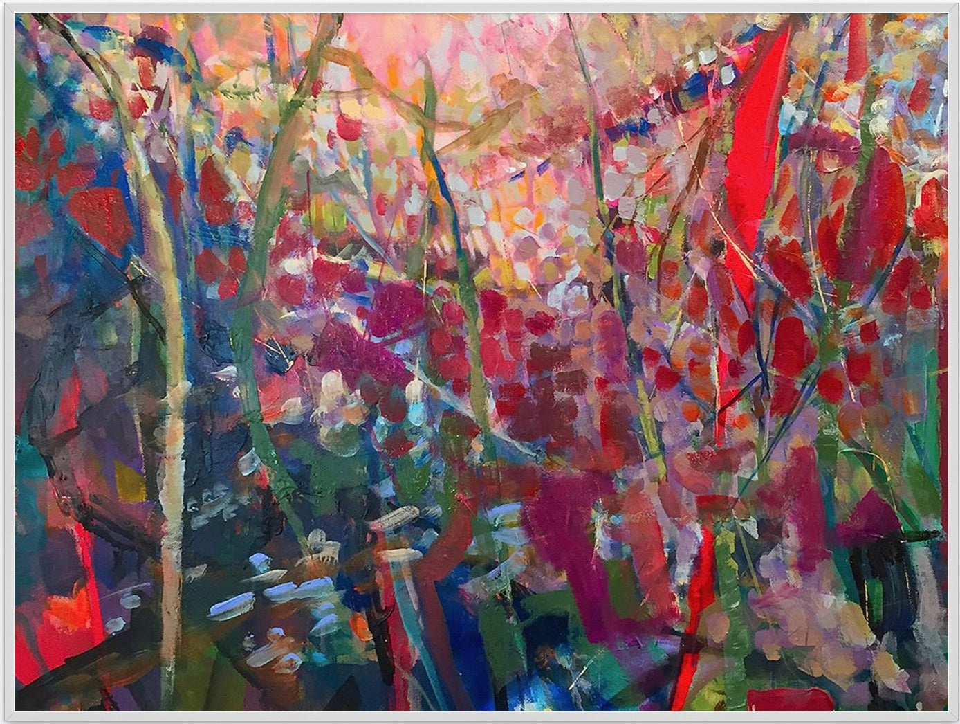 This paint is a perfect print as it has a powerful focal point, designed to anchor and elevate high-end interiors. Johnson transcends mere landscape, offering an intensely visceral and intuitive journey into nature's emotional core.The print faithfully renders the original's masterful corporeal technique: rich, textural impasto layers are captured, allowing the surface to interact dynamically with light. The palette features sophisticated, luminous bursts of red, orange, cadmium yellow and oxidized bronze dissolving into deep umbers, and forest greens evoking the fleeting, golden light of a hidden autumn day.This work offers both emotional depth (stimulates introspection) and investment appeal, providing a timeless aesthetic anchor for a sophisticated contemporary collection. A statement of refined taste